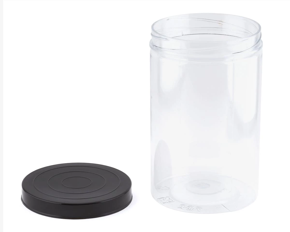 - Six airtight 8″ tall, 4.75″Â diameter PET tubes with screw on lid